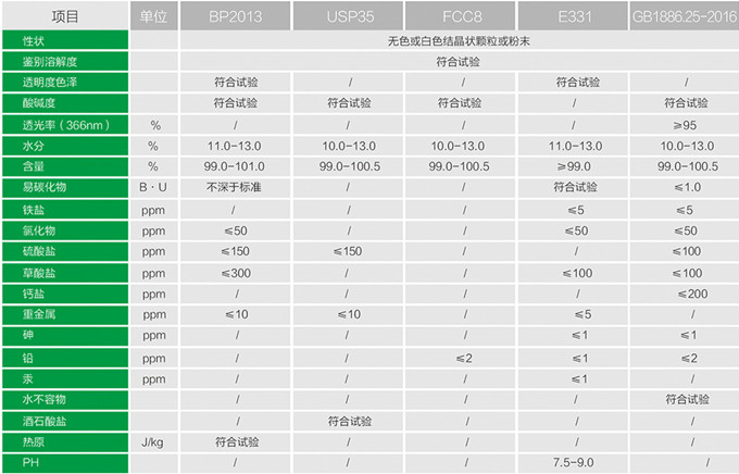 執(zhí)行標準:BP2013/USP35/FCC8/E331/GB1886.25-2016