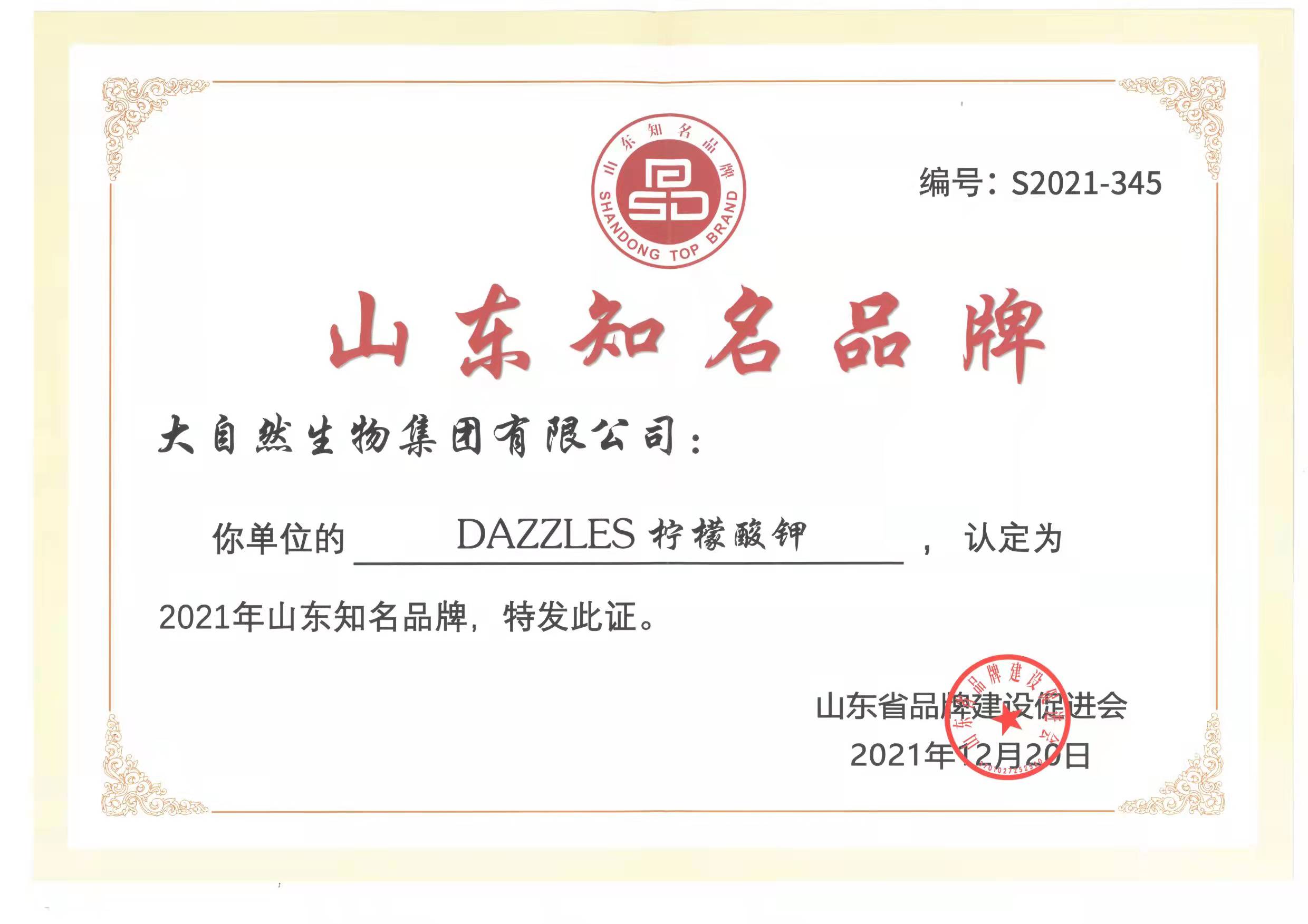 近日,大自然生物集團有限公司收到由山東省品牌建設促進會頒發的榮譽證書,公司的檸檬酸鉀產品榮獲“山東知名品牌”稱號。